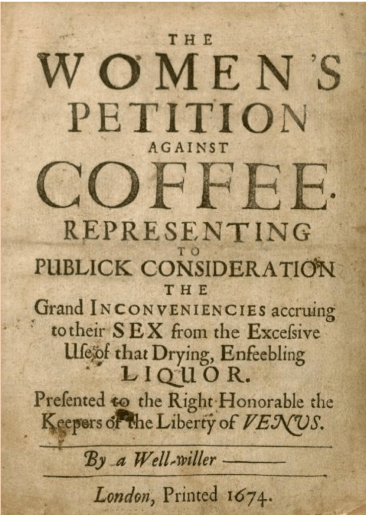 Sdoganato il caffè anche tra i cristiani, la bevanda si diffuse in tutta Europa. Arrivò in Inghilterra facendo nascere dal nulla centinaia di coffeehouse, che diventarono un importante luogo di ritrovo e attività anche politica. Le donne erano escluse dalla coffeehouse, e nel 1674 alcune di loro prepararono un’esilarante petizione contro il caffè. Secondo la petizione, “il caffè rende gli uomini impotenti e ciarlieri; bevono acqua sporca e cominciano a blaterare cose senza senso, fino a farli diventare ancora più pettegoli di noi donne”.
