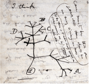 “Gli esseri organizzati rappresentano un albero, irregolarmente ramificato, giacché alcuni rami sono di gran lunga più ramificati di altri. – Di qui i generi. Tante gemme terminali muoiono, quante ne sono generate di nuove… L’albero della vita dovrebbe forse essere chiamato il corallo della vita, giacché la base delle ramificazioni è morta.”