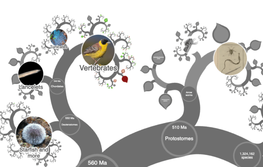 Da allora, il semplice schizzo di Darwin è cresciuto sino a diventare un albero della vita enorme, con milioni di specie catalogate. nessun disegno potrebbe contenerlo tutto, ma sono disponibili online versioni interattive che permettono di navigare lungo i rami dell’albero saltando dai batteri, alle coccinelle, a noi. Clicca su una delle immagini qui sotto per navigare tra le specie viventi.