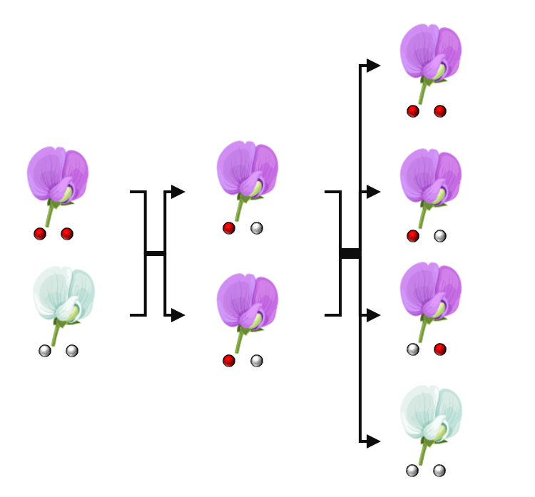 I caratteri studiati sono unitari, non si mischiano tra loro. Un fiore è bianco o rosso, non rosa. I figli di un incrocio non hanno una miscela di tratti dei genitori, ma sempre e solo uno dei due tratti, che io chiamo fattore dominante. Accoppiando una pianta di fiori rossi con una di fiori bianchi, la prima generazione ha sempre tutti i fiori rossi; il fattore recessivo dei fiori bianchi sembra scomparire, ma non è così. La seconda generazione, presenta ¾ di fiori rossi e ¼ di fiori bianchi.
